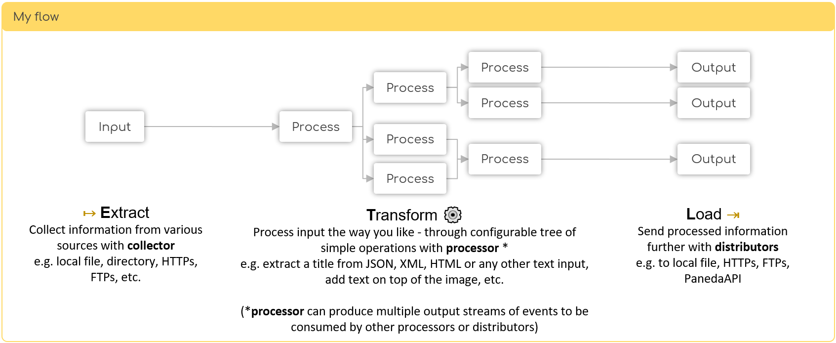 Processors are processing (e.g modifying fields, removing duplicates, taking some other actions) information inside the Flow. Specific processor types require specific configuration attributes (e.g name of fields to be removed or added). Processor can consume multiple input stream of events from collectors or other processors. Processor can produce multiple output streams of events to be consumed by other processors or distributors.